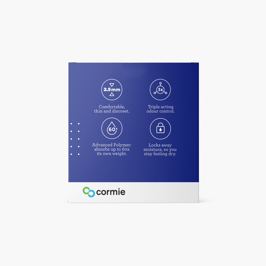 All Cormie products have scientifically engineered quilting to move liquid away from your skin and a scientifically developed polymer absorbs up to 60 times its weight in fluid and locks it in, so you will stay dry.